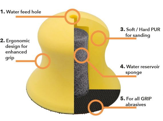 Durable PUR hand-held sanding blocks with a comfortable ergonomic design. Our water feed models feature an internal foam reservoir delivering a constant source of water to stop your abrasive drying out.